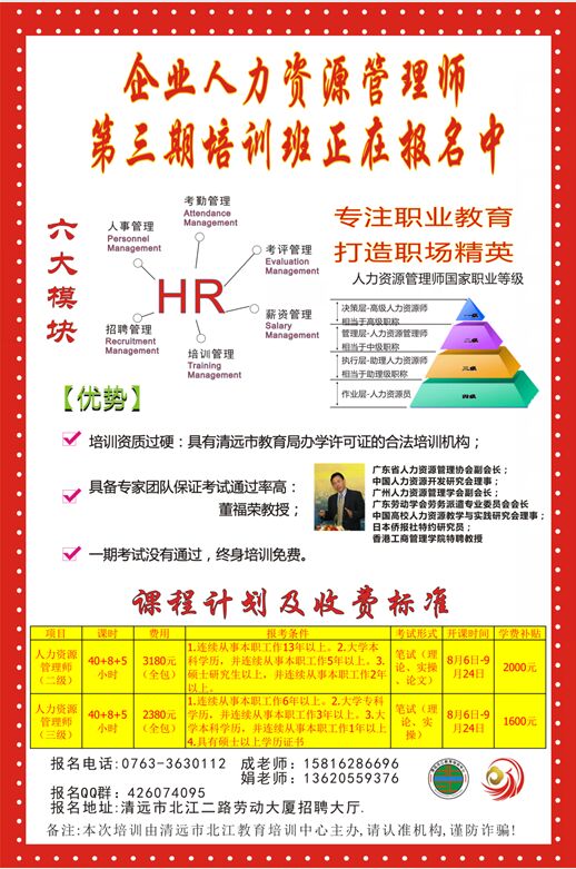 企業(yè)人力資源管理師第三期培訓(xùn)班正式開(kāi)始報(bào)名,歡迎各位有意向了解或者想考的小伙伴到勞動(dòng)大廈一樓現(xiàn)場(chǎng)咨詢。本次培訓(xùn)由清遠(yuǎn)市北江教育培訓(xùn)中心主辦,請(qǐng)認(rèn)準(zhǔn)機(jī)構(gòu),謹(jǐn)防受騙。